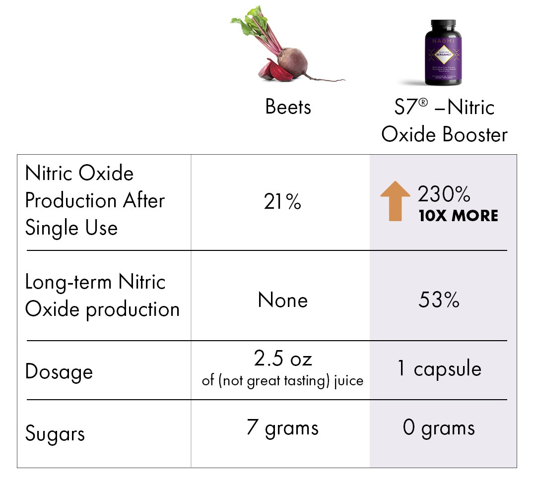 S7 is a patented, all-natural blend of green tea, blueberry, kale, tart cherry and other botanicals and it’s far more effective than beets for boosting Nitric Oxide levels. Studies show it can raise N-O by 230% after the first dose and a sustained level of 53% over the long run. Compare that to beets, which increases N-O by only 21%. Higher N-O levels meals better blood flow – which leads to better energy, more stamina and healthier blood pressure.